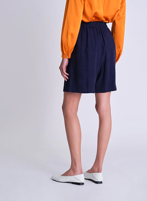 The satin high-waisted mid-thigh Kucheza shorts are a relaxed fit with a straight leg. They have an elasticated waistband and an imitation fly construction on the front, along with wide welt pockets. The trousers are made in sustainable cotton viscose blended satin. Indigo color.Details: