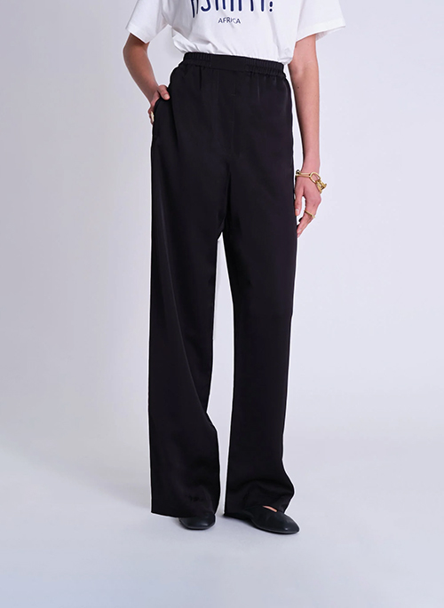 The Zola high-waisted straight leg trousers have a relaxed fit and elasticated waistband. Shaped for comfort, the pyjama style trousers have an imitation fly construction on the front, along with wide welt pockets. The trousers are made in a dotted jacquard lightweight sustainable viscose. Black color.Details: