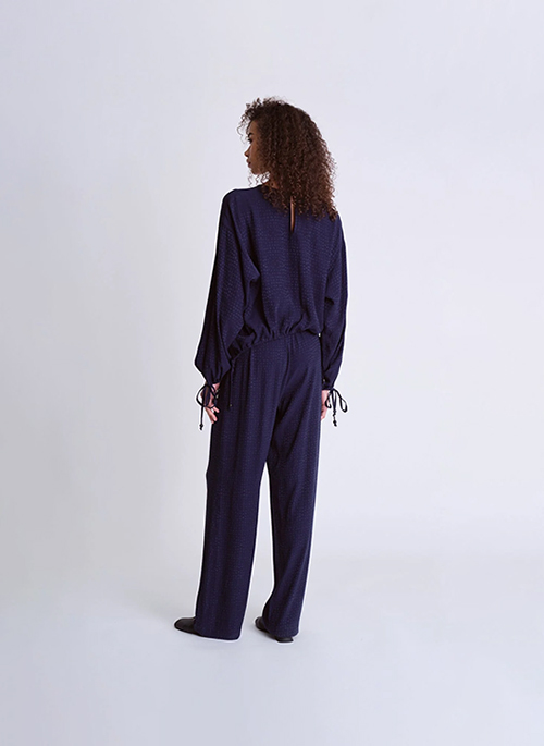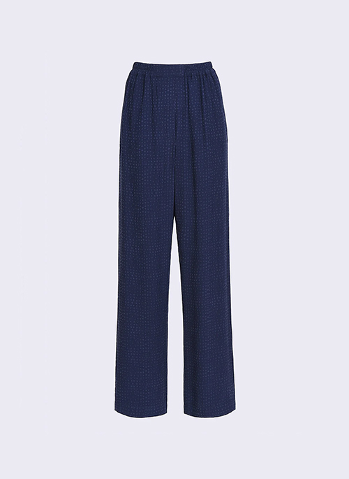 The Zola high-waisted straight leg trousers have a relaxed fit and elasticated waistband. Shaped for comfort, the pyjama style trousers have an imitation fly construction on the front, along with wide welt pockets. The trousers are made in a dotted jacquard lightweight sustainable viscose. Navy color.Details:
