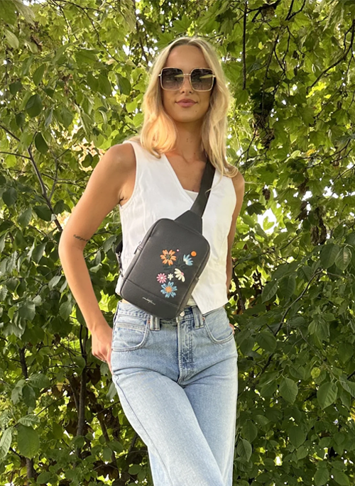 The Elsa sling is a modern sling bag that has lots of room and so much style. Made with soft pebbled vegan leather it is adorned with a colorful spring floral design. The Elsa sling is the perfect handsfree bag for travel or everyday.