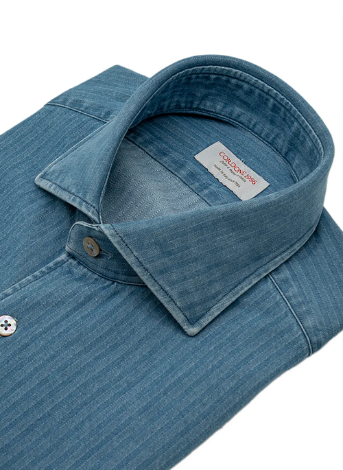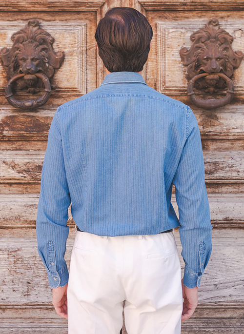 Embossed denim light blue shirt is one of our most popular and versatile shirts. A wardrobe essential, made from Italian denim, garment washed for a softer fabric and featuring seam effects. A versatile and timeless shirt, suitable for any business or casual look constructed with shifted sleeve pattern with mother-of-pearl button and hand-finished buttonhole.Details:
