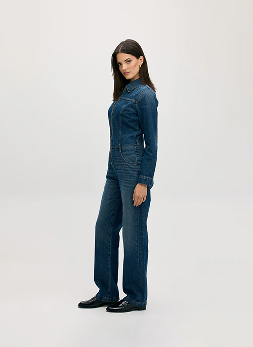 An icon in one piece. Inspired by Farrah Fawcett, this indigo Rodeo jumpsuit cinches at the waist and kicks into a wide leg for balance. Utility seaming keeps it sharp; the fit keeps it unforgettable.