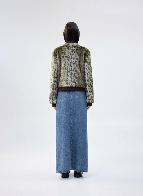 The Foliage Jacket pairs utilitarian elements with playful textures. Leopard jacquard fur and sleek ribbed trims evoke everyday elegance, while a gunmetal zipper adds a polished finish.