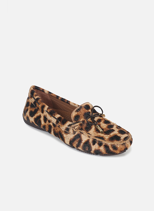 The Francis moccasin is made of fur with an animal print. The design features a side cutout with a leather strap running across the entire side, finished with a smooth leather bow at the front with metal tips. It has a cushioned insole for added comfort and a rubber sole.