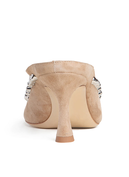 Dressy camel suede mule with a medium heel. This elegant pump is elevated with a row of studs and a pointed toe. A cushioned insole will guarantee comfort all day. This sexy, fun and dressy mule will complement jeans, pants, trousers, skirts and dresses alike! Perfect for a garden party, date night, wedding, New Year's Eve or to elevate your evening outfit.Details: