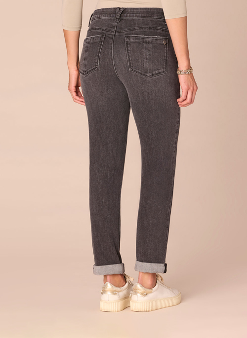 Our washed black artisanal Girlfriend style is fitted through the thigh, with a relaxed fit from the knee to the leg opening. Wear them cuffed for a classic Girlfriend silhouette, or release the cuff for an even more relaxed look. Engineered with "Ab"solution® fit technology to smooth, support, and enhance your shape—giving you everything from a flatter tummy to a perkier rear view.