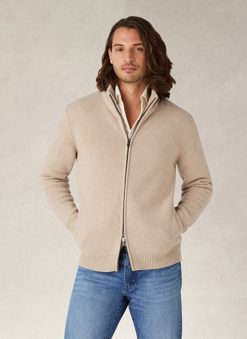 Equal parts softness and structure. The Graham Full Zip Sweater is knit in a 5-gauge jersey stitch from a luxurious blend of cashmere and merino wool. Racking details at the neck and cuffs add subtle texture, while the front features ribbed double pockets and a covered two-way zipper for a clean finish.Inside the collar, contrast piping in Golden Poppy and Pacific Blue nods to signature Robert Talbott detailing.Details: