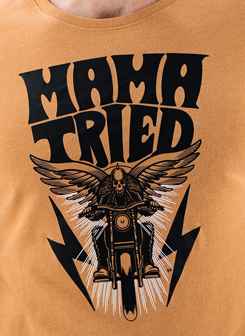 Mama tried—so you might as well own it. This tee lets your rebellious streak fly with a nod to the ones who raised us and the roads that shaped us. Cut from ultra-soft cotton jersey, it’s built for comfort, breathability, and raising a little hell.Details: