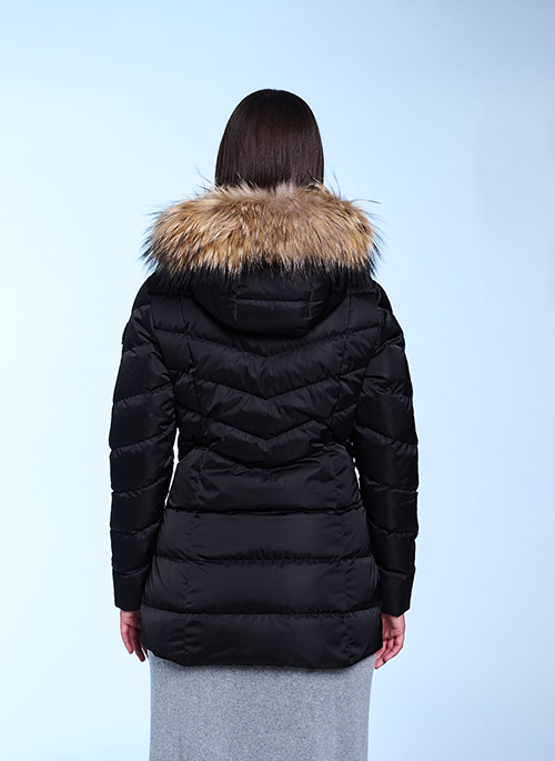 Women's short down jacket with a V-shaped cut. Center closure with a custom double-zipper closure. Pockets with invisible zippers. Fixed hood with detachable natural fur. Interior pocket with invisible zipper. Water-repellent and windproof fabric. Thermoregulating down filling.Details: