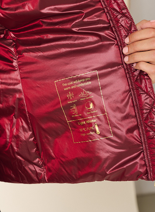 Women's short down jacket. Custom center zip closure. Detachable hood with visor and pull tabs. Pockets with invisible zippers. Water-repellent and windproof fabric. Thermoregulating down filling. Packable.