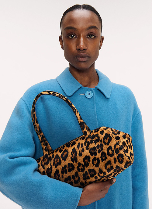Our Helios bag features a sleek, elongated east-west shape and comfortable shoulder straps for easy wear. Available in five colorways in premium suede, ponyhair, and crocodile-stamped leather.