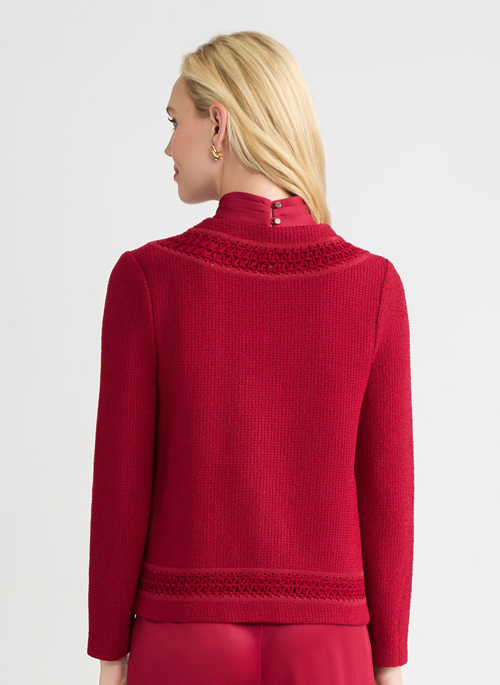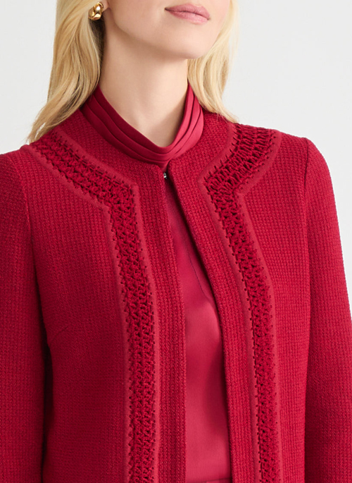Draped in tonal scarlet red, this jacket exudes modern poise. The jewel neckline and long sleeves bring refined simplicity, while delicate crochet-knit trim lends an artisanal finish. Designed for moments that call for quiet sophistication, it’s the perfect piece to elevate evening gatherings or special occasions.
