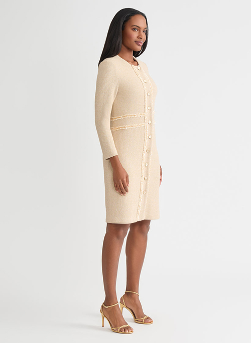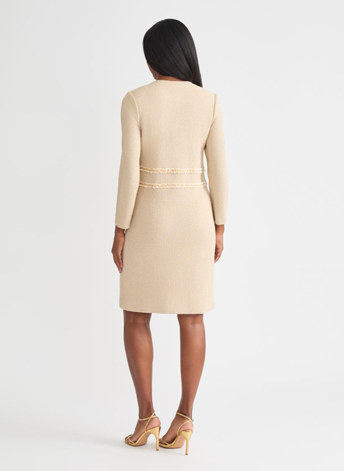 The Lurex Ribbon Chain Trim Knit Jacket is a study in modern opulence. Crafted in a refined biscotti-and-gold palette, it gleams with subtle metallic threads that catch the light with every movement. Finished with ribbon chain trim, this jacket becomes a statement of artistry and elegance. Whether layered over an evening dress or styled with sleek trousers, it transforms any ensemble into an occasion.