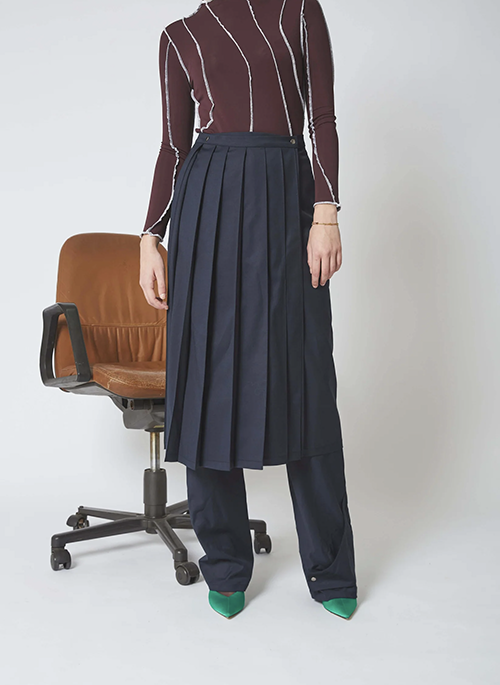 Details: High-waisted skirt, calf length.Pleated at the front with a strong cut in the shape of blue leaves.Fastens with a snap button.