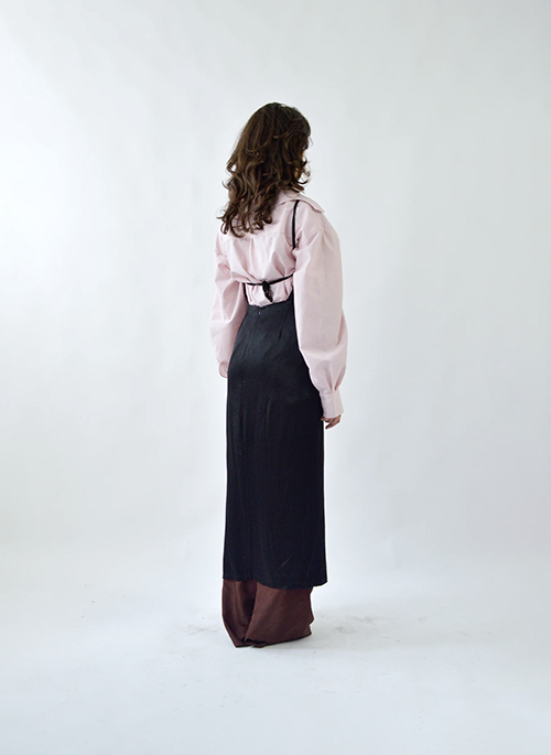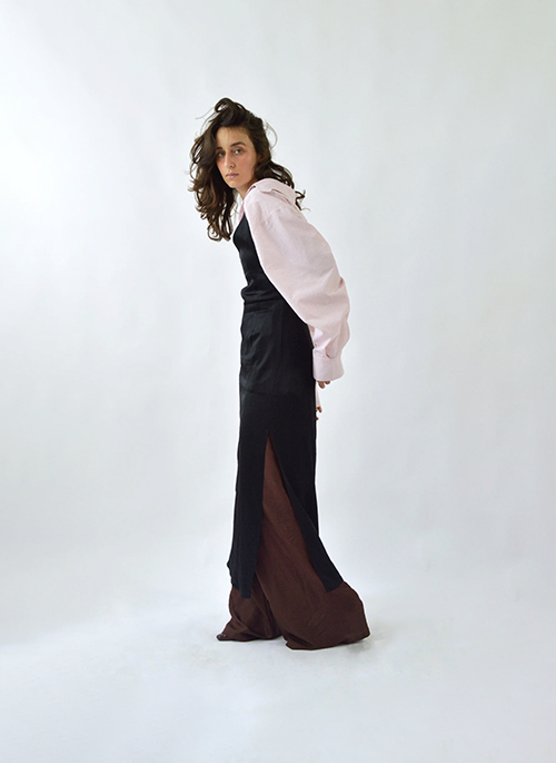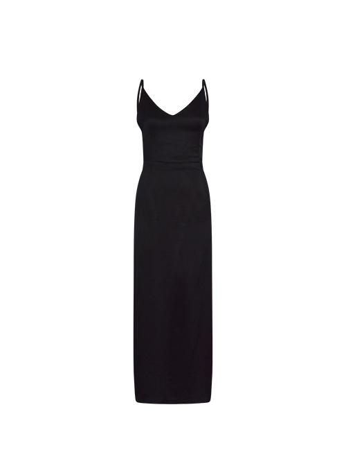 Details: Long black satin dress, open backThin straps adjustable with a knot at the backFitted cut, discreet slit at the bottomElegant V-neck A fluid piece that can be layered or worn on its own.