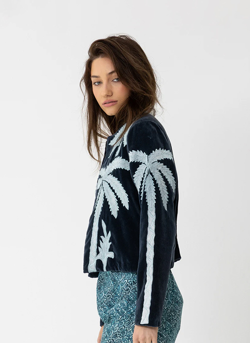 Inspired by the Art Deco influences of 'D'gournay' and the chic architecture of old school Palm Springs. This statement piece blends resort energy with city dressing. Crafted from a lightweight cotton velvet base, with stunning art deco palm trees expertly appliquè on the front, back and sleeves. Fully lined in cotton, this jacket will elevate any outfit instantly.