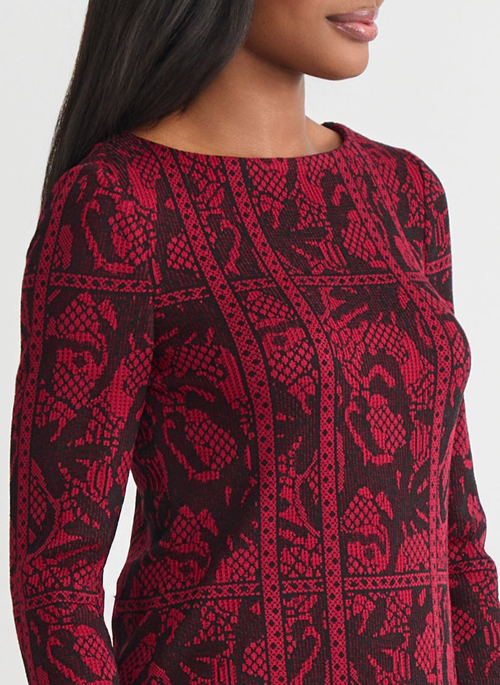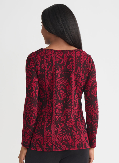This soft knit tunic is distinguished by a refined jacquard pattern that adds depth and quiet sophistication. A graceful boat neckline and long sleeves create timeless balance, while side slits and an easy pullover design ensure comfort and effortless wear. Perfect for occasions that call for elevated simplicity.