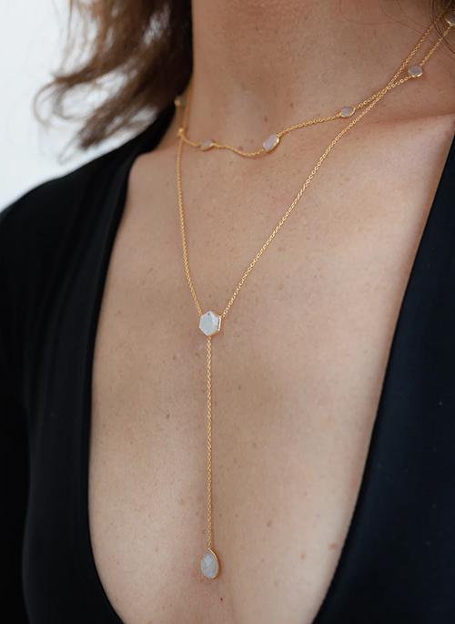 Elevate your jewelry collection with the Le Meme Lariat Necklace, crafted from sterling silver and plated in 14k gold for lasting elegance. This delicate chain features moonstones set in unique octagon and teardrop shapes, designed to rest gracefully just above the cleavage. Its refined design offers a subtle yet sophisticated accent, perfect for layering or wearing alone to enhance any outfit with a touch of expert craftsmanship.Details: