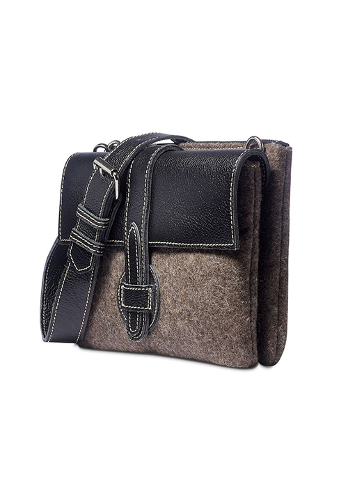 The Leanne cross body is the ideal small bag for every day. It is constructed in wool blend with leather front closure and handles. It has two pockets. The front one features a leather fold over closure and the back one has a zip top. It easily fits a wallet, cellphone, and anything else one needs on a daily basis.Details: