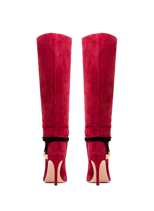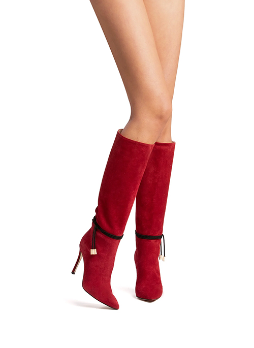 Elegant suede boot with a skinny heel and optional triple loop ankle string. Pointed / almond toe. Made in Italy with highest materials and craftsmanship.Details: