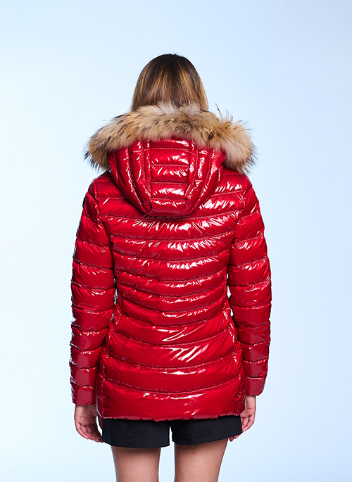 Women's short down jacket. Center closure with a custom double-zipper closure. Zippered pockets. Detachable hood with natural fur. Water-repellent and windproof fabric. Thermoregulating down filling.Details: