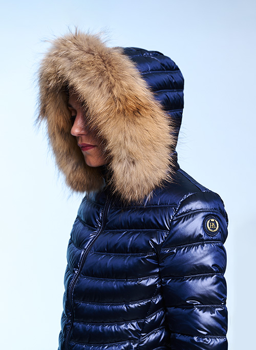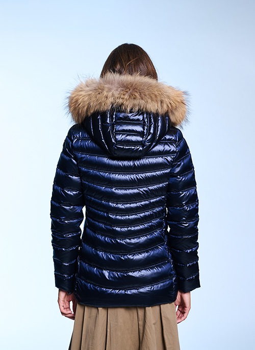 Women's short down jacket. Center closure with a custom double-zipper closure. Zippered pockets. Detachable hood with natural fur. Water-repellent and windproof fabric. Thermoregulating down filling.Details: