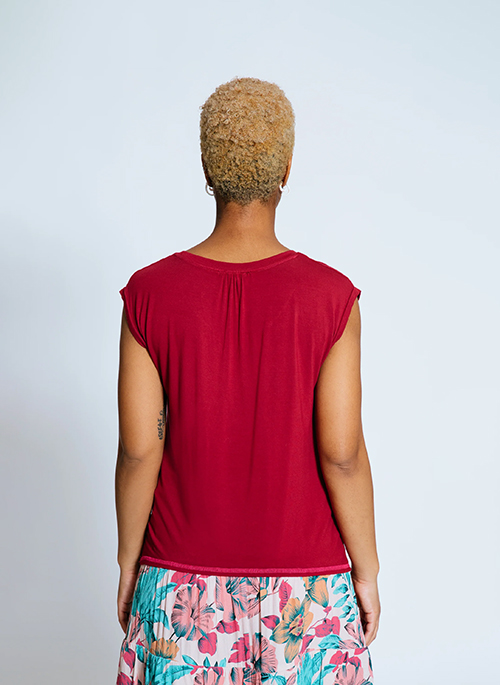Our Wine Kimi overdyed top was originally our Kimi low-high shirttail in Magenta color, upcycled in collaboration with Suay and their community dye project (their color Oxblood). This scoop-neck, shirttail hem top is a great basic, and even more great that it's made from sustainable bamboo jersey. It's so soft that you'll want to sleep in it! Collect them in all the colors available - it's the only one you'll need for errands, for work, and it's especially great for traveling.Details: