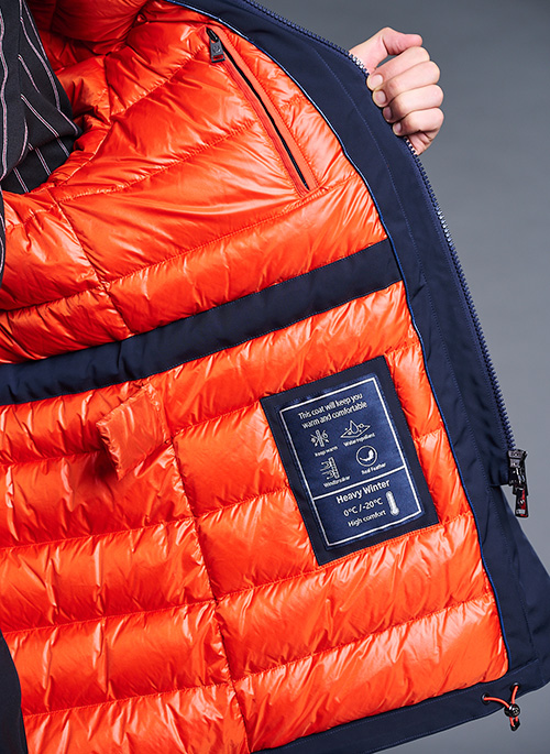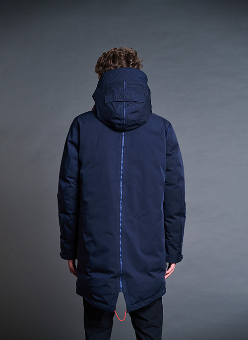 Men's long parka. Center closure with a custom double-zipper and snaps. Two chest pockets with custom zippers. Two flap pockets with snaps. Detachable hood. Interior pocket with custom zipper. Contrast lining. Water-repellent and windproof fabric. Thermoregulating down filling.Details: