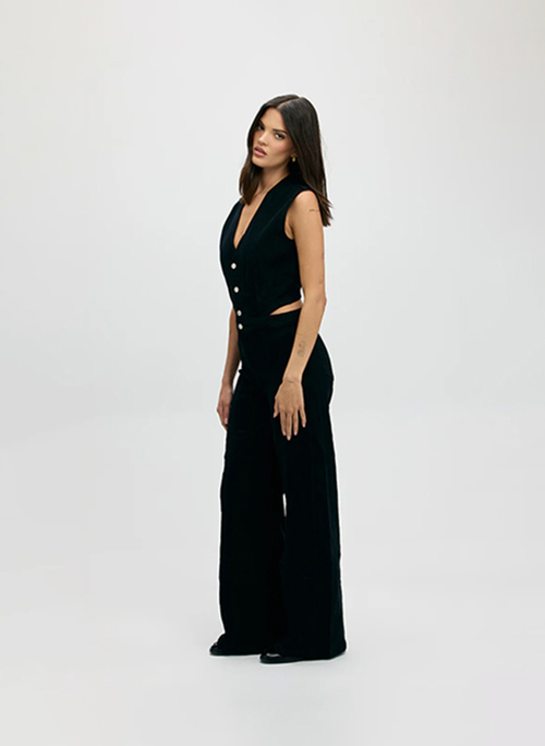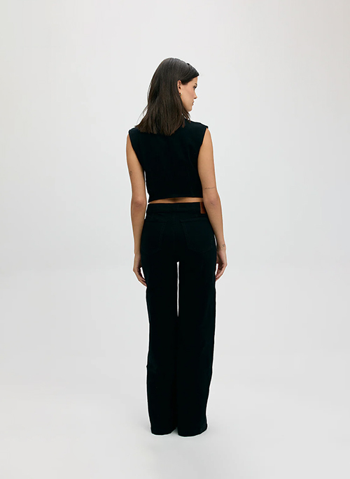 A high-rise wide leg with vintage polish. Slim at the waist, fluid through the hip, opening into a dramatic silhouette. In Jet Black, it is elegant, elongating, and unforgettable.