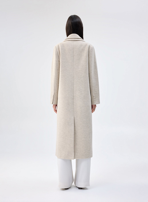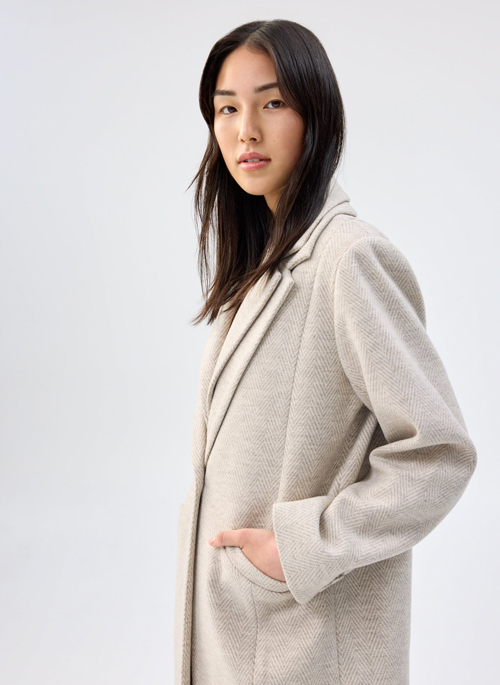 The Malta Coat is a new take on a classic topcoat, designed to imply layering with a dramatic double notch lapel. Crafted with soft faux wool material in an herring-bone pattern.