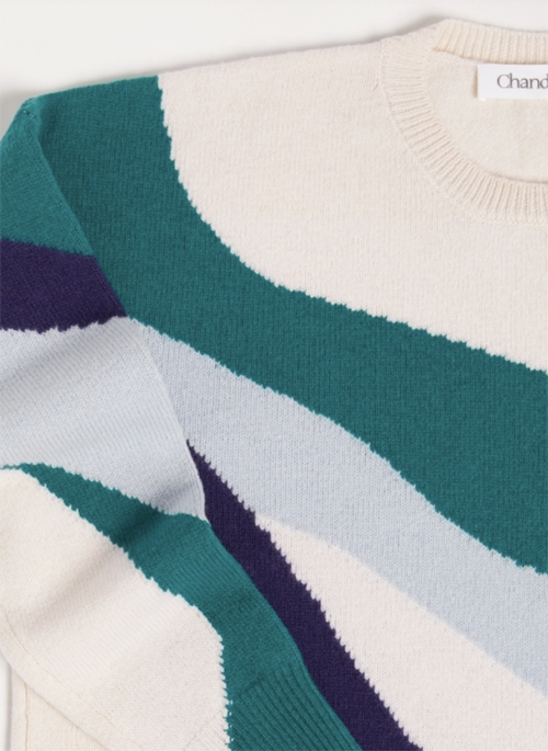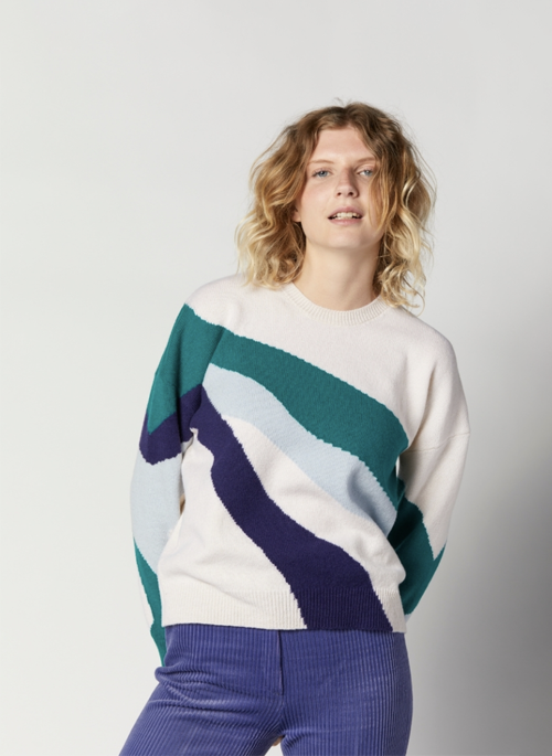 Our Synes sweater is a multi-colored women's sweater 100% French merino wool knitted in intarsia. Its 4 soft and deep colors Emerald green, Frost blue, Ecru and Night blue will evoke fear of being a frozen lake in the middle of a boreal forest.