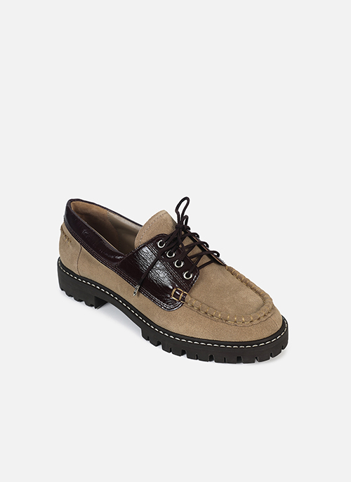 The Mavie moccasin is made of suede, with patent leather details, and features a robust and contemporary design inspired by the classic boat shoe style. The model has front laces, a moccasin-style upper, and a lug sole that ensures stability, comfort, and a modern look, making it ideal for creating versatile outfits that transition between urban casual and relaxed elegant.