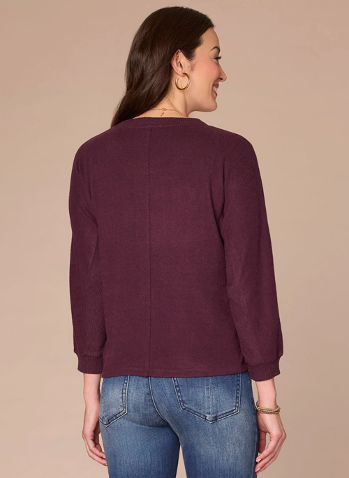 Although this mixed media knit top is comfy, it’s far from basic. Banded three quarter sleeves, a mandarin collar, V-placket, embroidered soutache detailing, and a twist front add visual interest and shape to your look.