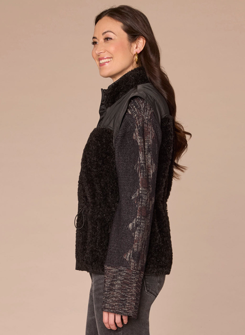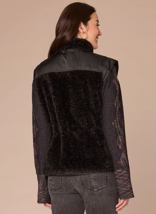 Featuring a funnel neck, zip front, side entry pockets, and toggle waist ties, this contrast mixed media vest is a stylish cold-weather essential. Wear it out and about with friends, to the Farmer’s Market, or for the school run.