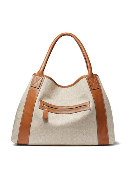 The Michelle Tote is constructed in refined linen, with topstitched leather trim and handles. The Michelle Tote has a classic, oversized silhouette, with a twist! The bag can be cinched at the center with hooks on the sides to make it more of a true handbag size and used fully open as a tote bag or weekender. A snap closure keeps your bag's contents secure, and a built-in loop makes it easy to find your keys. This bag is very lightweight and will not add significant weight to your shoulders.
