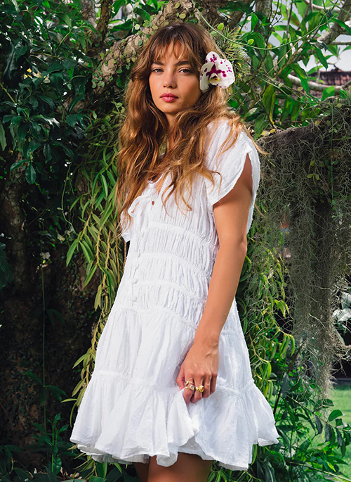 The Srikandi dress is an exquisite masterpiece, thoughtfully crafted by our skilled artisans in Bali. Designed with a captivating elegance, its intricate layered ruffles flow with every movement, ensuring you remain the focal point of attention in any setting. Named after Srikandi, the legendary female warrior from the revered Hindu epic Mahabharata, this dress evokes the strength, bravery, and wisdom of its namesake. Srikandi, who distinguished herself among the monumental heroes of this sacred narrative, has become an enduring symbol of female empowerment in Indonesia, embodying the ideals of independence and resilience.Details:
