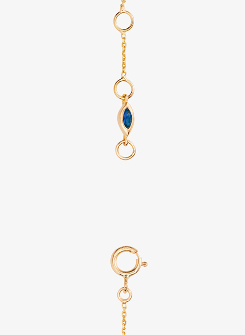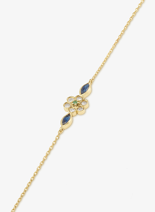 An everyday jewel for every occasion. With the Miniflower Blue bracelet, a delicate flower in timeless hues will delicately adorn your wrist. The Miniflower bracelet 1 is handmade in recycled 18-carat yellow gold and set with 9 precious stones : 6 diamonds salt & pepper, 1 emerald and 2 navy blue sapphire Marquise-cut. The clasp is delicately trimmed with a navy blue sapphire, the brand’s signature. The chain is adjustable in length to 15.5, 16.5 and 17.5 cm.Details: