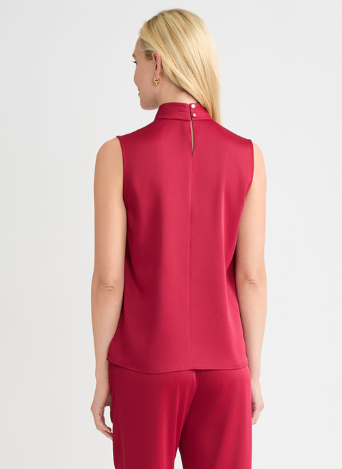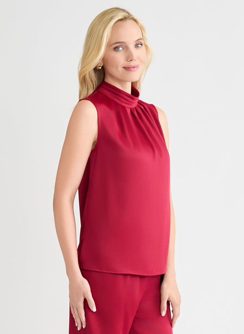 Layer your everyday looks with this crisp, red blouse that instantly freshens your ensemble with a timeless color that captures warmth and light. The crepe de chine fabric is soft and flowy with an unlined fit that allows the top to be worn alone or blend perfectly under additional layers. The high mock neck features neat pleats that serve as a decorative detail, adding to this blouse's fresh, sophisticated look.