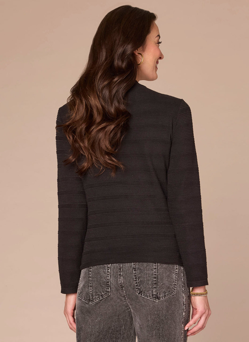 This stretchy staple knit top is a go-to for office days, brunch with your friends, or date night. It has long sleeves, a mock neck, asymmetrical side ruching, and a shirttail hem.