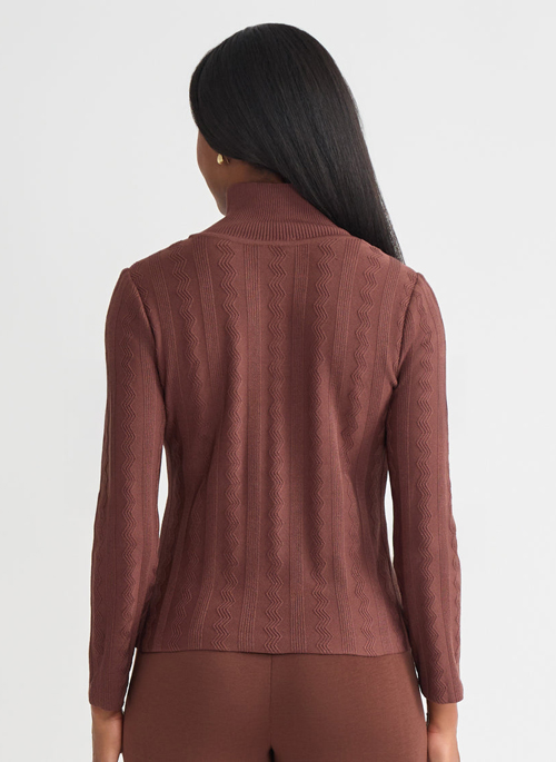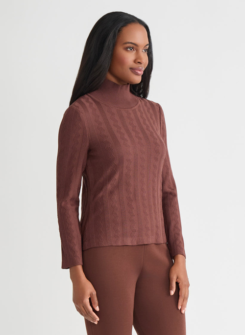 A foundation of refined dressing, this mock neck top is crafted in tonal truffle brown soft knit for a sleek, versatile finish. Long sleeves and an easy pullover design ensure comfort, while the clean silhouette makes it an elegant piece for layering or standing alone. Designed for moments that call for understated sophistication.