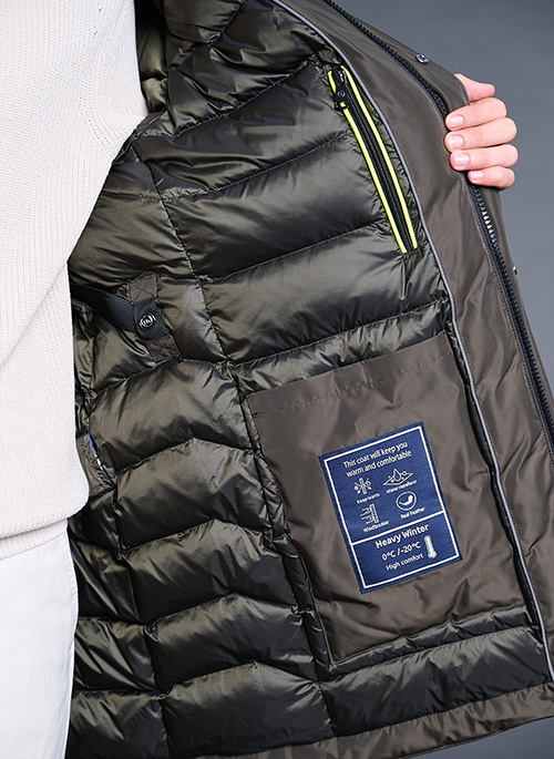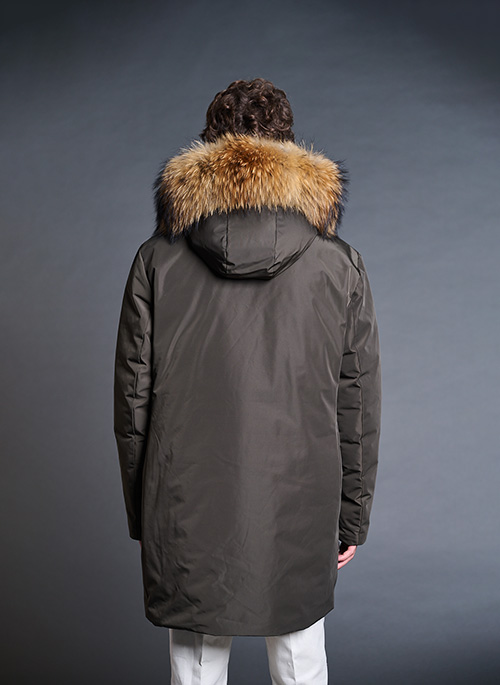 Men's long parka. Center closure with a custom double-zipper and snaps. Pockets with custom zippers. Detachable hood with removable natural fur. Two interior pockets, one with a custom zipper and the other with Velcro closure. Backpack-style interior pulls allow the garment to be worn over the shoulders. Windproof and water-repellent fabric. Thermoregulating down filling.