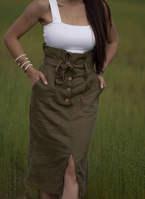 Details: 100% organic linen 100% handmade High waist Sold with the belt but you can choose the more casual mode 180 g/m2 Washed linen Coconut buttons