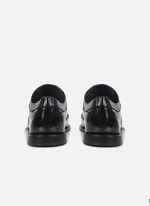 The Oxford Olivia is made of patent leather with a distressed finish, which stands out for its sophisticated shine, striking texture, and contemporary look. It also features a classic brogue design, adding elegance to the style. It has a leather sole, ensuring comfort, durability, and a refined finish, making it ideal for creating versatile looks, from smart casual to more elaborate outfits.