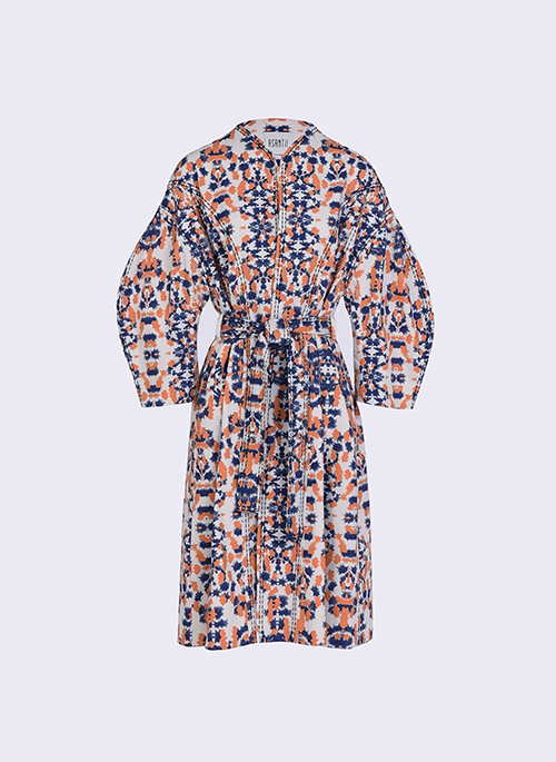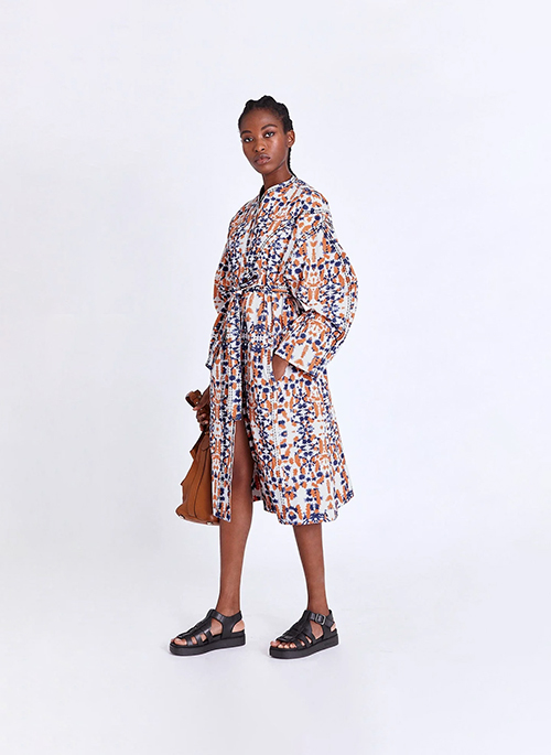 Details: Oversized wrap coatHand embroidery stitch detail, produced by a Rwandan Embroidery CooperativeDropped shoulders Self fabric sash beltSide seam entry pocketsFully lined