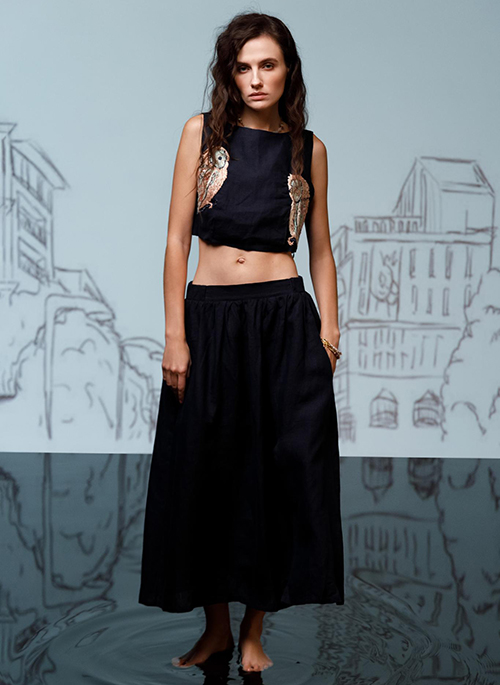 - Embroidered sleeveless top, highlighting meticulous details inspired by the refined plumage of the owl