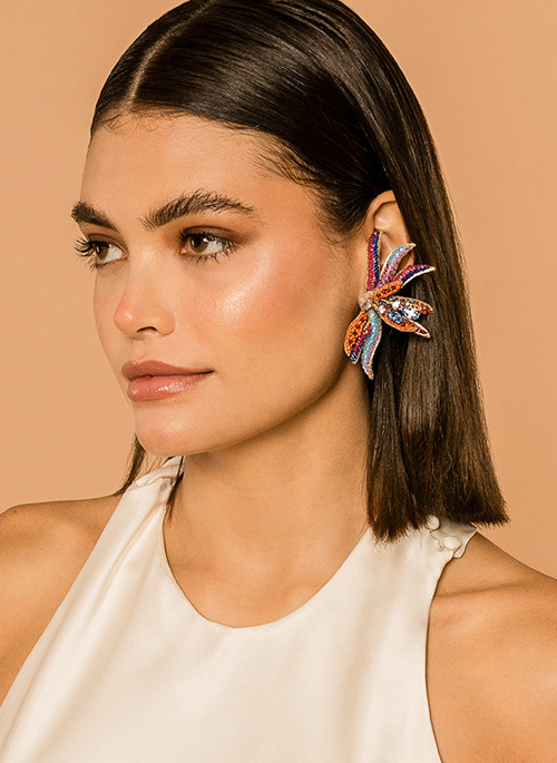 Hand Embroidered Clip-On Earrings.Details:CottonGlass BeadsGlass Stone Metallic ThreadMild Steel ClipLeather backingSize: Length 3" | Width 2"