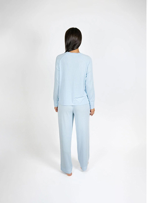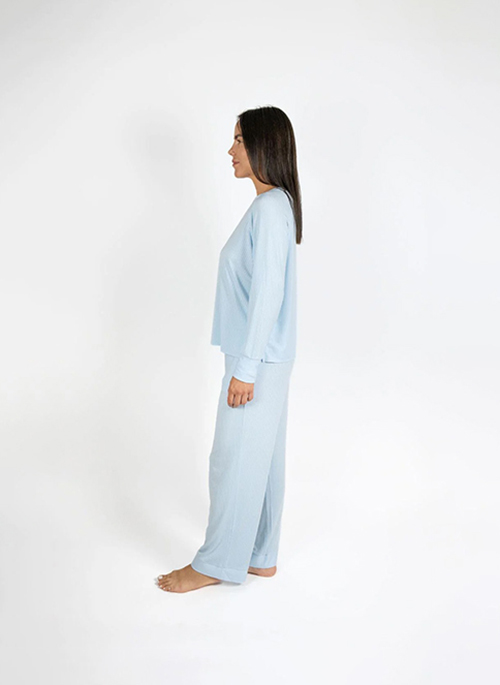 Cannes Pinstripe Long Set in Cool Blue is an elevated loungewear set made from a premium rib-knit pinstripe fabric, where the stripes are not printed, they are created through a special knit that adds texture, elegance, and better airflow. The result is a lightweight, breathable feel with a beautiful drape that falls smoothly on the body. This fabric is naturally travel-friendly, it resists wrinkles, packs easily, and looks polished straight out of your suitcase.