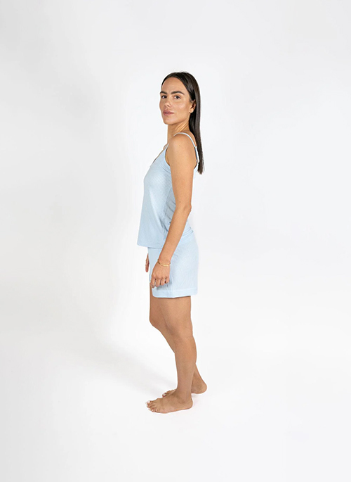 Cannes Pinstripe Shorty Set in Cool Blue is a lounge set made from our signature pinstripe knit, where the pinstripes are not printed, they are created through a special rib-knit technique. This textured knit adds a refined look and improves airflow, keeping the set light, breathable, and comfortable against the skin. The fabric drapes beautifully, resists wrinkles, and packs effortlessly, making it a perfect travel pajama set for weekends away and hotel mornings.