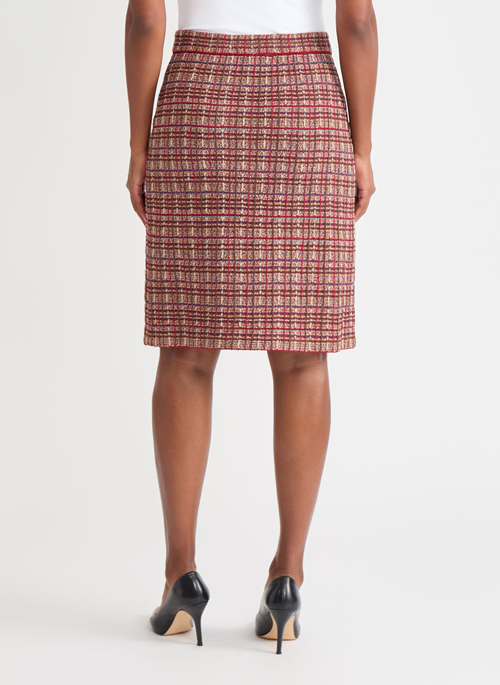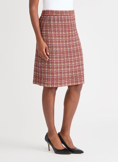 This straight skirt is crafted in a refined plaid multi-stitch knit with a sleek pull-on design for effortless wear. Its tailored silhouette offers polish and versatility, making it the perfect complement to the matching jacket for a look that transitions seamlessly from desk to dinner.