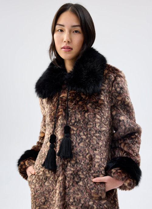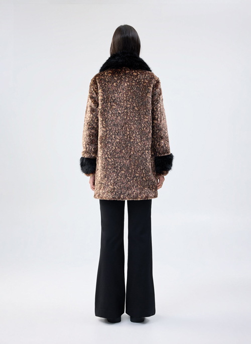 Custom leopard jacquard fabric and lush faux fur accents offer a bold yet refined aesthetic. The Planet Earth Coat is perfect for those who seek both impact and intention.